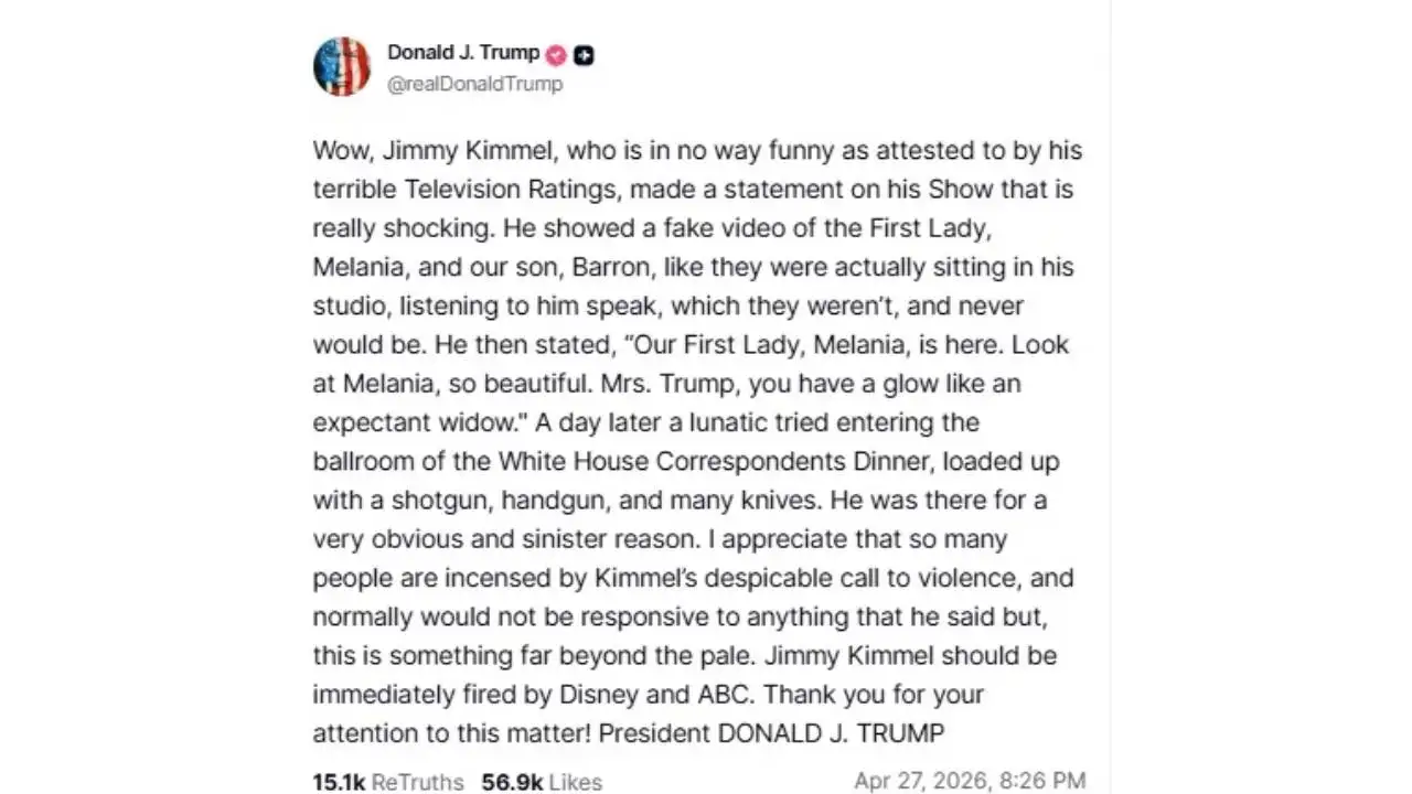 من ناحيته، وصف ترامب في منشور عبر منصة "تروث سوشيال" ما تلفظ به كيميل بأنه "دعوة حقيرة للعنف"، وذلك بعد أن أطلق المذيع نكتة خلال محاكاة ساخرة لعشاء مراسلي البيت الأبيض، واصفاً ميلانيا بأنها تبدو "كأرملة تنتظر قدرها".
